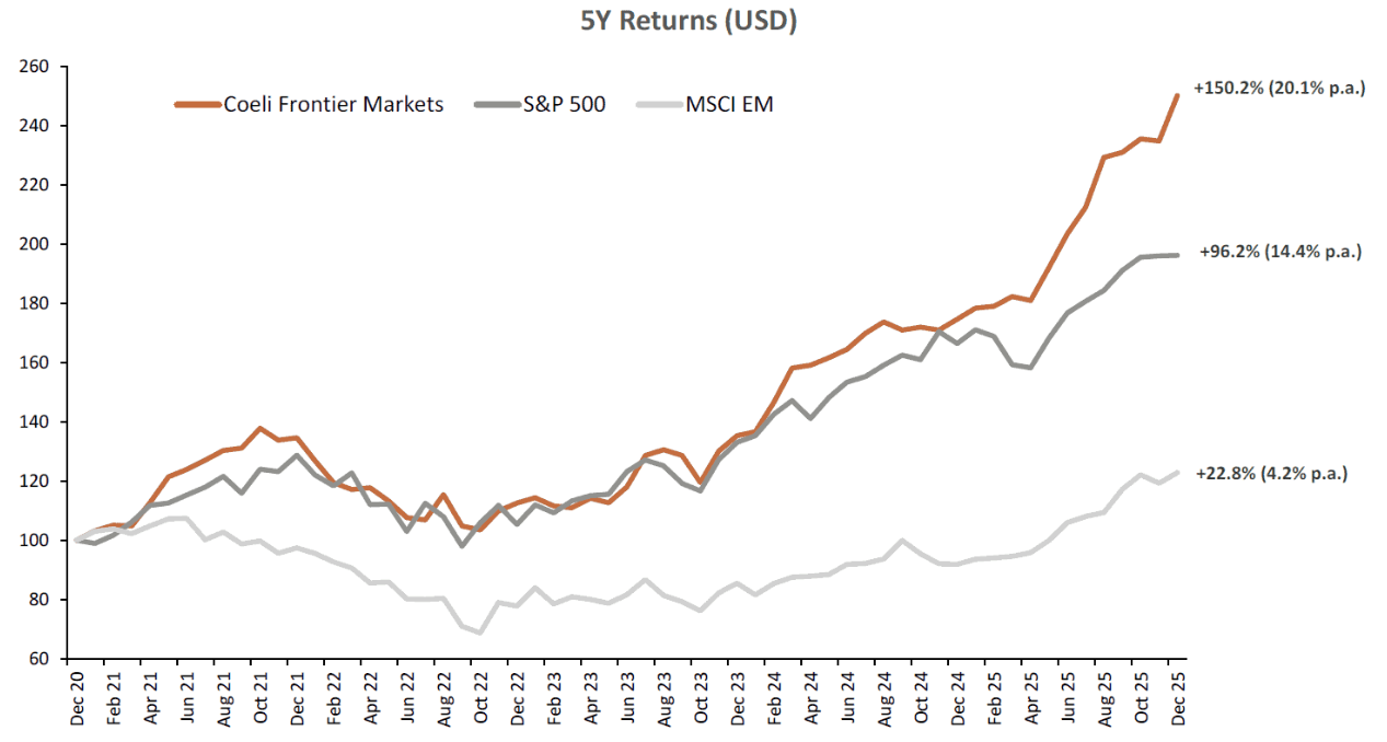 En fond som avkastat 150% på fem år och ändå handlas till halva värderingen av breda tillväxtmarknadsindex. Det är utgångsläget för Coeli Frontier Markets inför 2026.